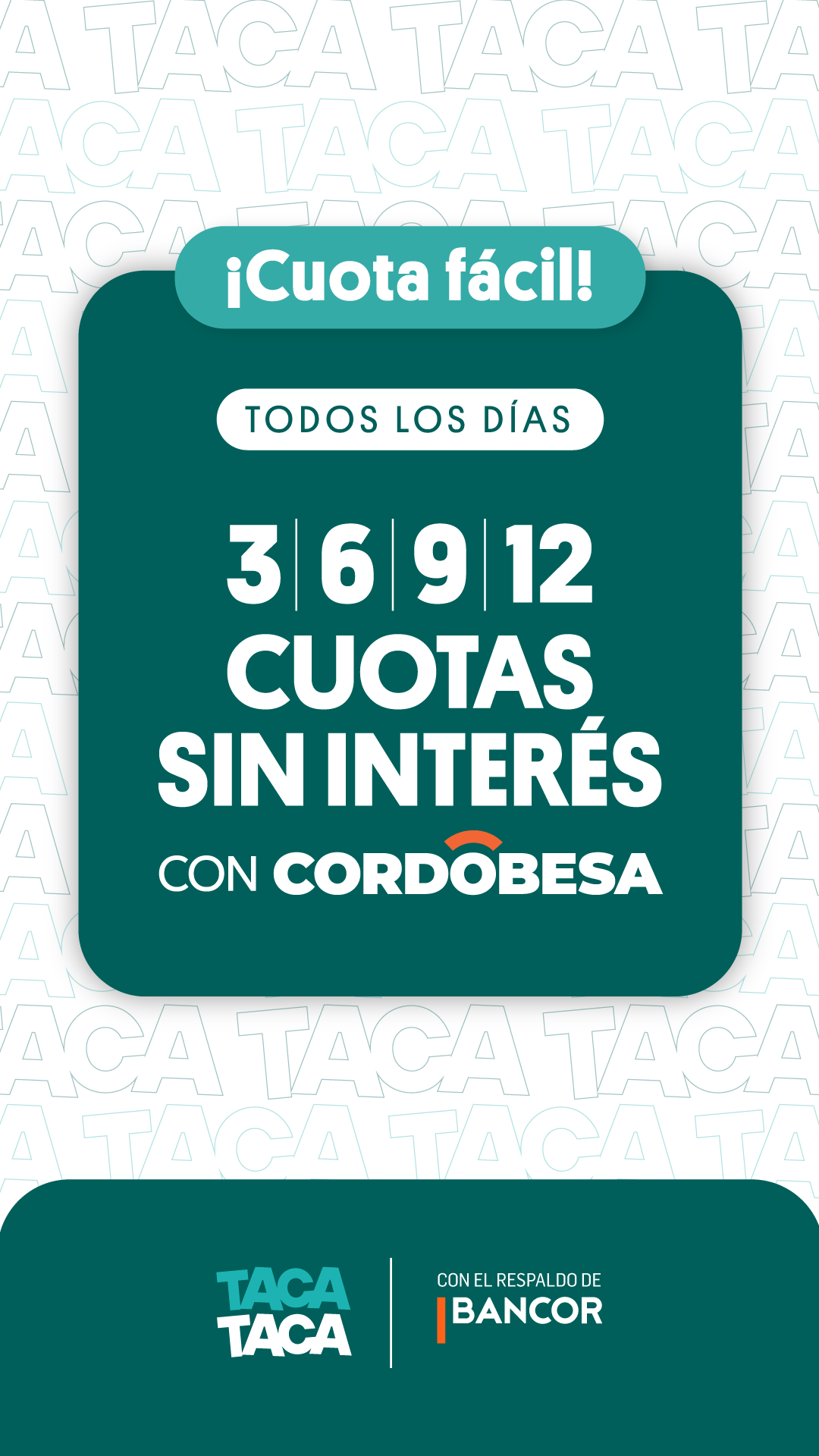 Las personas usuarias registradas en Taca Taca podrán ofrecer a sus clientes 3, 6, 9 y 12 cuotas sin interés todos los días de marzo de 2026, utilizando tarjetas de crédito de la marca Cordobesa MasterCard o Visa, a través del lector MiniPOS, SmartPOS, QR o link de pago de Taca Taca. Comisiones de acuerdo con el plazo de acreditación configurado en la App y a la cantidad de cuotas elegidas: para 3 cuotas sin interés: acreditación en el acto 13,19% + IVA; en 2 días hábiles 12,69% + IVA; en 7 días hábiles 11,29% + IVA; en 15 días hábiles 9,69% + IVA; en 21 días hábiles 8,79% + IVA; en 30 días hábiles 8,29% + IVA; en 45 días hábiles 6,80% + IVA. Para 6 cuotas sin interés: acreditación en el acto 20,39% + IVA; en 2 días hábiles 19,89% + IVA; en 7 días hábiles 18,49% + IVA; en 15 días hábiles 16,89% + IVA; en 21 días hábiles 15,99% + IVA; en 30 días hábiles 15,49% + IVA; en 45 días hábiles 14,00% + IVA. Para 9 cuotas sin interés: acreditación en el acto 27,89% + IVA; en 2 días hábiles 27,39% + IVA; en 7 días hábiles 25,99% + IVA; en 15 días hábiles 24,39% + IVA; en 21 días hábiles 23,49% + IVA; en 30 días hábiles 22,99% + IVA; en 45 días hábiles 21,50% + IVA. Para 12 cuotas sin interés: acreditación en el acto 34,39% + IVA; en 2 días hábiles 33,89% + IVA; en 7 días hábiles 32,49% + IVA; en 15 días hábiles 30,89% + IVA; en 21 días hábiles 29,99% + IVA; en 30 días hábiles 29,49% + IVA; en 45 días hábiles 28,00% + IVA. Válido para la provincia de Córdoba. Sujeto a disponibilidad y activación del servicio en cada localidad.