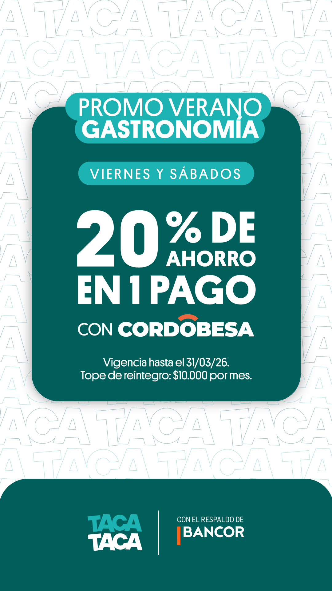 Las personas usuarias registradas en Taca Taca bajo el rubro de restaurante, bar o venta de artesanías y artículos de arte podrán ofrecer a sus clientes 20% de ahorro para compras en 1 pago, utilizando tarjetas de crédito de la marca Cordobesa MasterCard o Visa, a través del lector MiniPOS, SmartPOS, QR, Tap to Phone o link de pago de Taca Taca. El reintegro corre por cuenta de Taca Taca y tiene un tope de $10.000 pesos por mes y por cuenta. Beneficio vigente todos los viernes y sábados desde el 1 de diciembre de 2025 al 31 de marzo de 2026. Comisiones de acuerdo con el plazo de acreditación configurado en la App: en el acto 6,19% + IVA, en 2 días hábiles 5,29% + IVA, en 7 días hábiles 4,29% + IVA, en 15 días hábiles 2,99% + IVA, en 21 días hábiles 2,49% + IVA, en 30 días hábiles 1,39%; en 45 días hábiles 0,00% + IVA. Válido para la provincia de Córdoba. Sujeto a disponibilidad y activación del servicio.